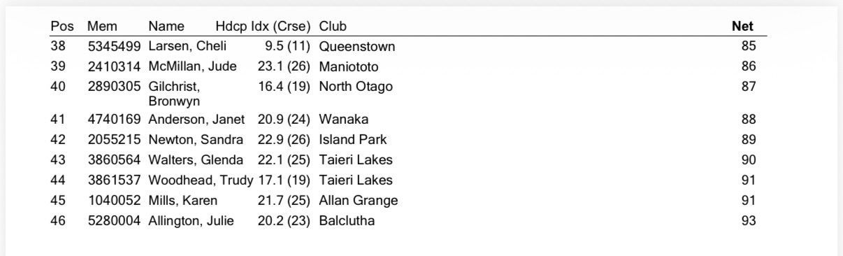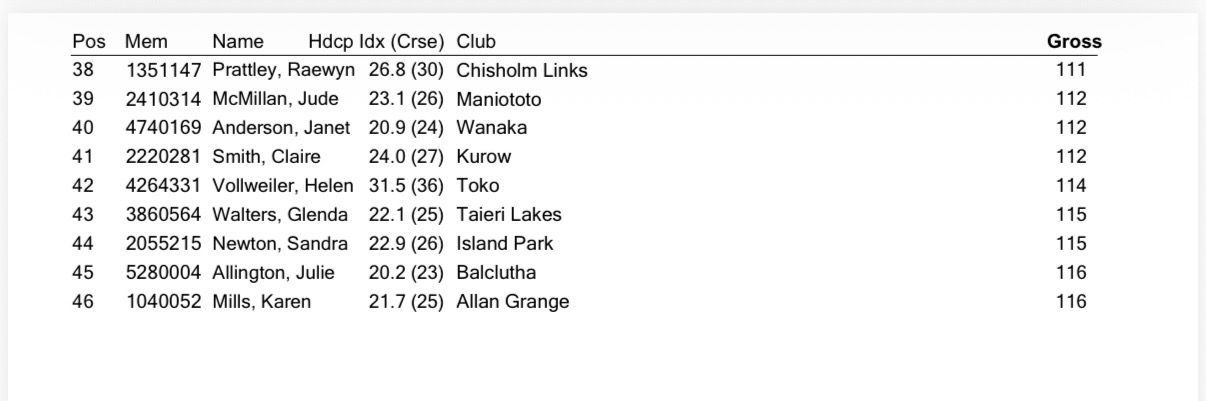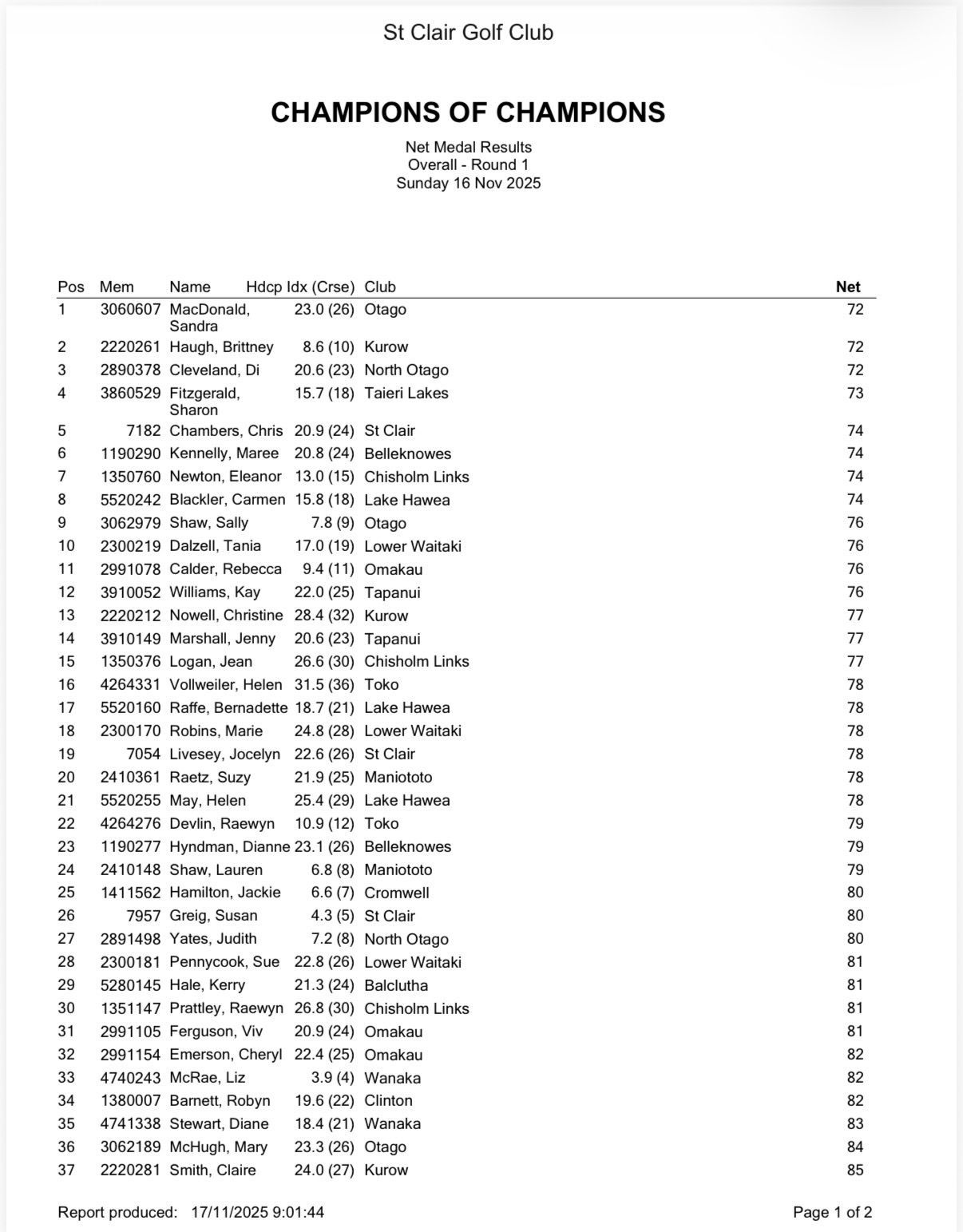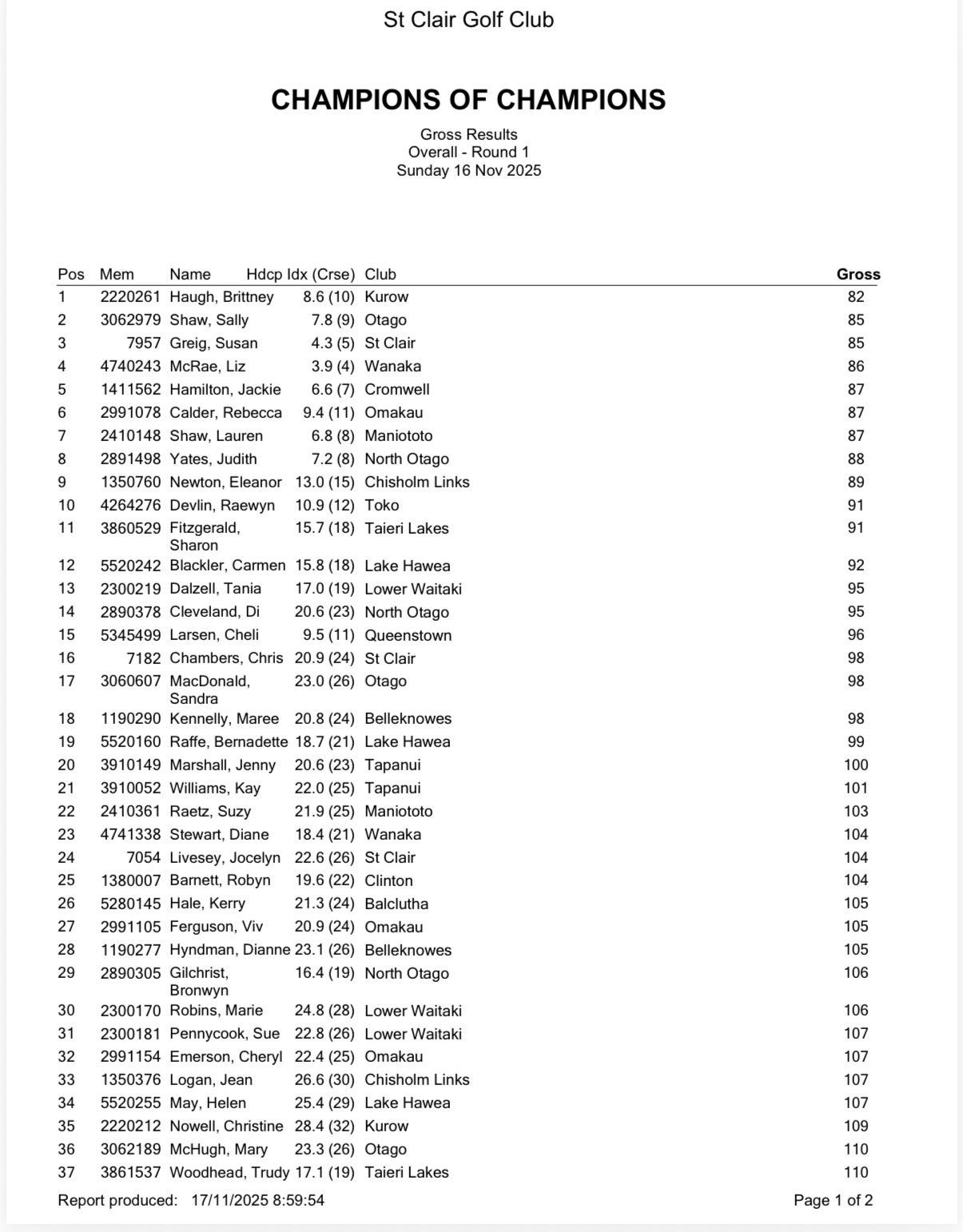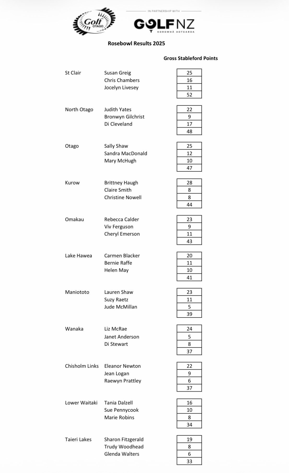 Results for Otago Champion of Champions, Gross Stableford Played on Sunday November 16th 2025